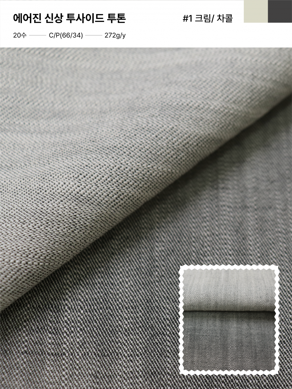 데님 감성의 CP 20수 슬럽 트윌 원단, 에어진 투사이드 투톤으로 26SS 시즌을 맞아 새롭게 선보입니다. 코튼과 폴리 소재를 서로 다른 컬러로 염색해 앞뒤에서 각각 다른 색감을 즐길 수 있는 것이 특징입니다. 뒤집어 사용해도 자연스럽게 어우러지는 균형 있는 컬러 구성은 여름 시즌 데님 스타일을 새롭게 확장합니다.