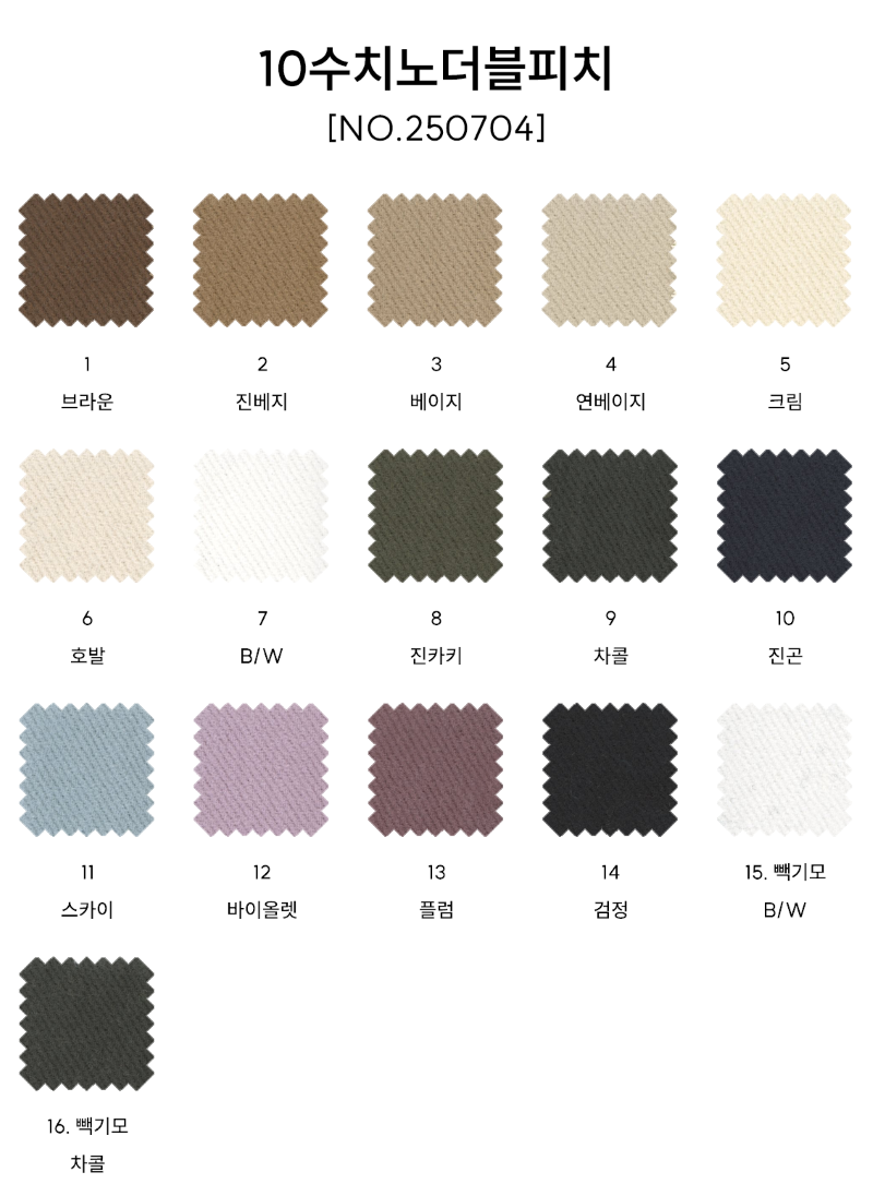 겉으로는 7수 특유의 굵직한 결이 보이면서, 실제 두께감은 10수의 안정감을 가진 원단입니다. 더블 피치 가공으로 표면에 부드러운 미세기모 터치가 두텁게 더해져 포근하고 매트한 질감이 살아납니다. 탄탄하면서도 터치가 부드러워 자켓·와이드 팬츠·숏 팬츠·유틸리티 셋업 등에서 묵직하고 캐주얼한 무드를 자연스럽게 표현하기 좋습니다.