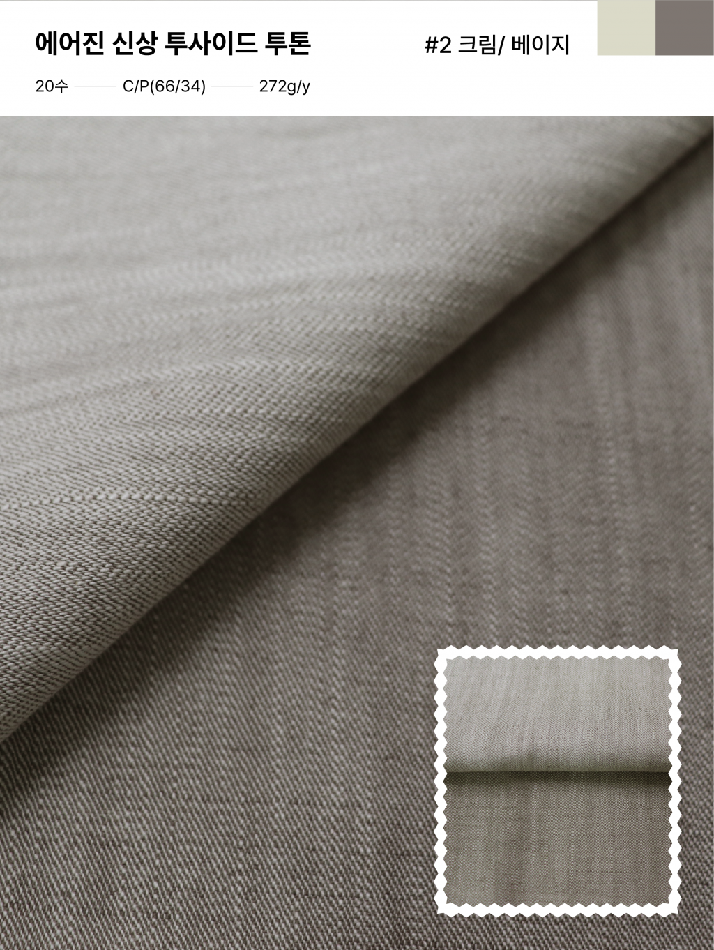 데님 감성의 CP 20수 슬럽 트윌 원단, 에어진 투사이드 투톤으로 26SS 시즌을 맞아 새롭게 선보입니다. 코튼과 폴리 소재를 서로 다른 컬러로 염색해 앞뒤에서 각각 다른 색감을 즐길 수 있는 것이 특징입니다. 뒤집어 사용해도 자연스럽게 어우러지는 균형 있는 컬러 구성은 여름 시즌 데님 스타일을 새롭게 확장합니다.